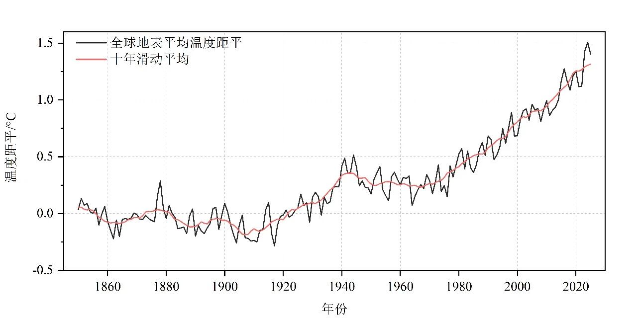 图1 1850~2025年全球地表平均温度距平序列(相对1850-1900年平均值)