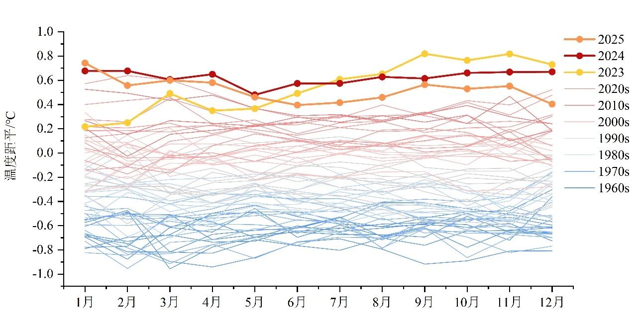 图2 全球地表月平均温度距平(1961年1月至2025年12月,相对于1991-2020年同期平均值)2025年用橙粗线表示,2024年用红粗线表示,2023年用黄粗线表示,其他年代用细线表示,从浅蓝色(1960年代)到浅红色(2020年代)