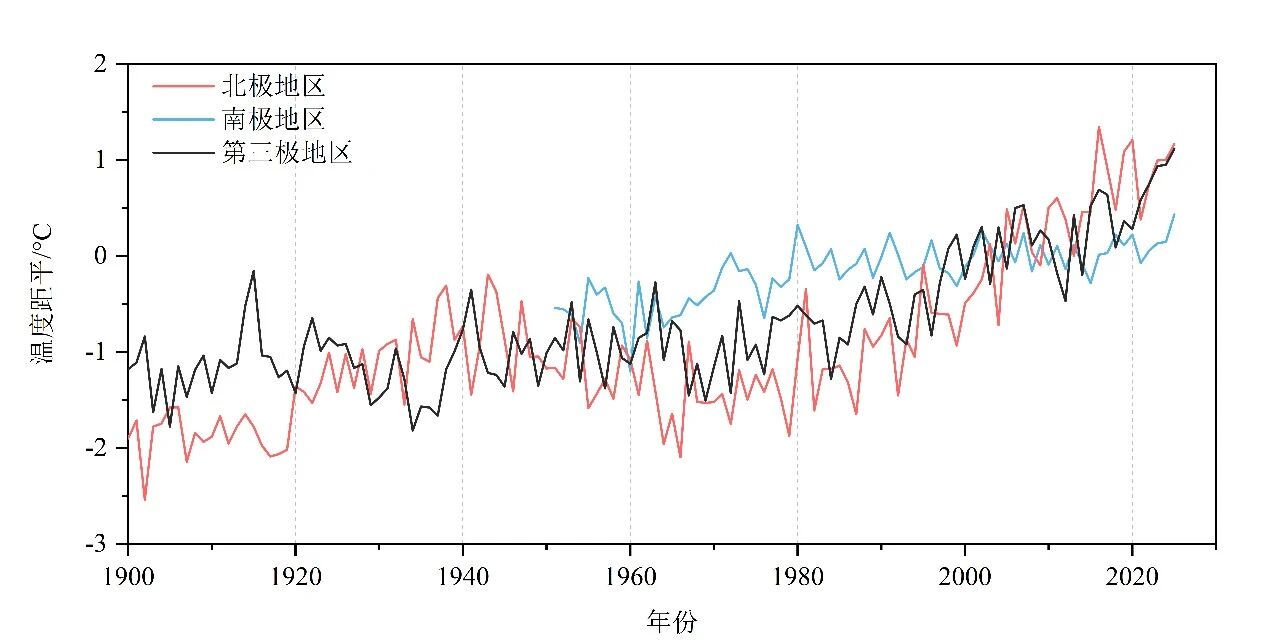 图4 1900-2025年南、北极地区和第三极地区平均温度距平(相对1991-2020年平均值)
